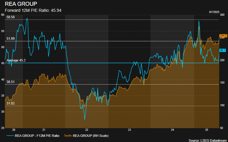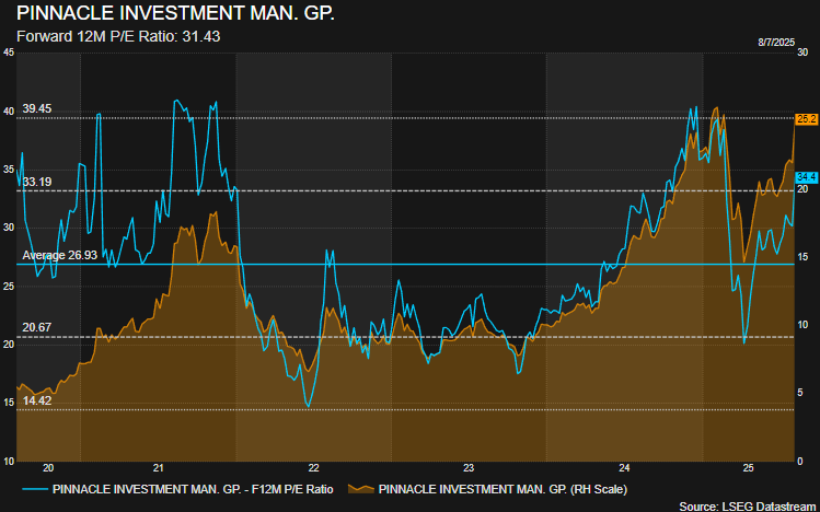 Now trading at 34x forward earnings, it’s “up there” but not at its peak. Average target prices imply only 2% upside. Expansion into Europe and the US is expected to keep driving growth, with FUM of $230bn forecast for FY26 (+28% YoY).