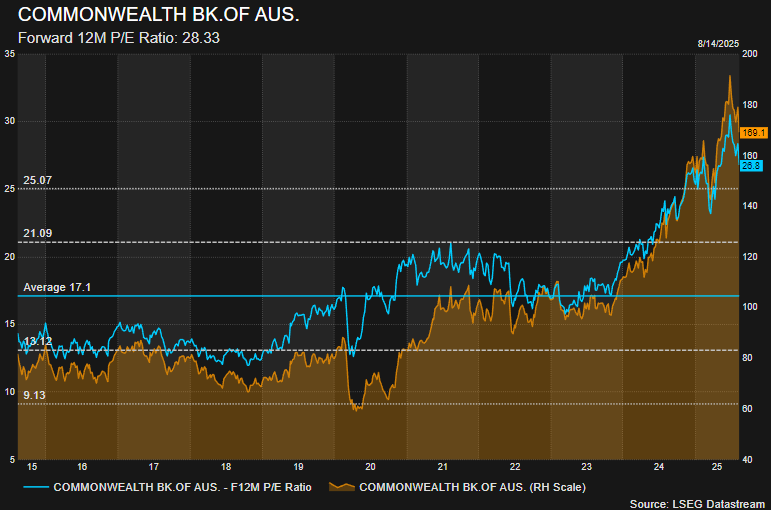 No surprises in the broker commentary. The key takeaway is management are playing the long game to stay ahead, focusing on AI investments for efficiency improvements, resulting in short-term costs rising. Post-yesterday, it’s still trading well above its 10-year PE average. Goes ex-dividend (260c) next Thursday.