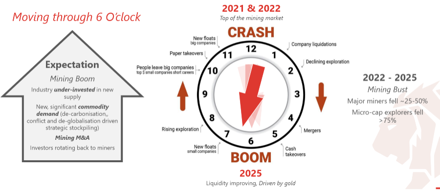 You see… Lion’s guiding light in the opaque world of resources is their ‘mining clock’. It’s a measure of liquidity and repeatable signs that each mining cycle exhibits like… well… clockwork. Here’s the point above all: timing the mining cycle is THE MOST ESSENTIAL THING in resource investing. Everything else is secondary to this consideration.